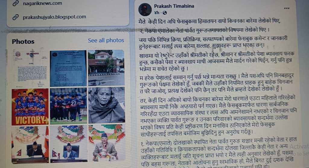 काठमाडौँ/पत्रकार प्रकाश तिमल्सिनाले पाँच दिन अघि फेसबुक स्टाटसमा नेकपा एमालेका पोलिटब्युरो सदस्य एवम् दोलखा इन्चार्ज पार्वत गुरुङ र उहाँको धर्मपत्नी सरस्वती राईले बालुवाटारमा सञ्चालन गरेको हिमालयन बायो रेष्ट्रेन्ट बारे भ्रमपुर्ण कुरा उल्लेख गरेकोमा आईतवार त्यसलाई सच्चाएका छन् ।