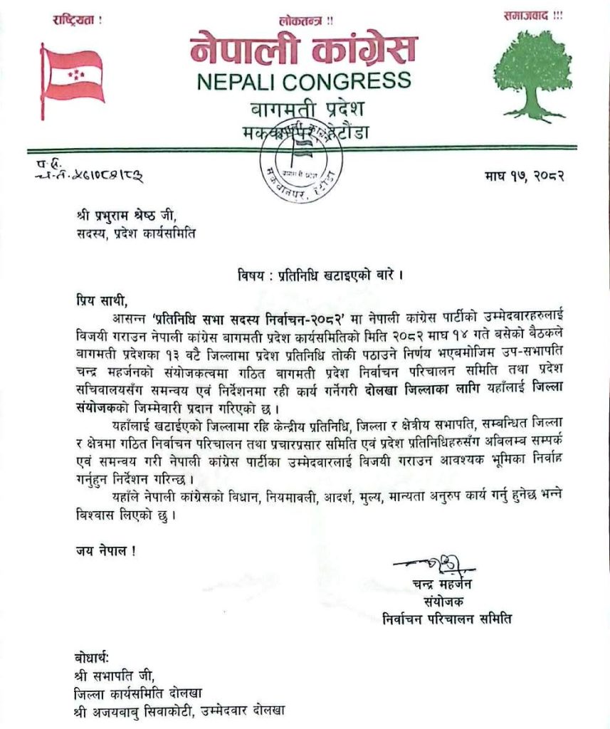 नेपाली कांग्रेस बागमति प्रदेश कार्यसमितिको माघ १४ गते बसेको बैठकले श्रेष्ठलाई उक्त जिम्मेवारी दिएको हो । संयोजक श्रेष्ठलाई दोलाखमा नेपाली कांग्रेसको उम्मेदवारलाई विजयी गराउन केन्द्रीय प्रतिनिधि, जिल्ला र क्षेत्रिय सभापति तथा सम्बन्धित जिल्ला र क्षेत्रमा गठन भएको निर्वाचन परिचालन, प्रचारप्रसार समिति र प्रदेश प्रतिनिधिसंग समन्वय गरी काम गर्ने जिम्मेवारी दिएको छ ।