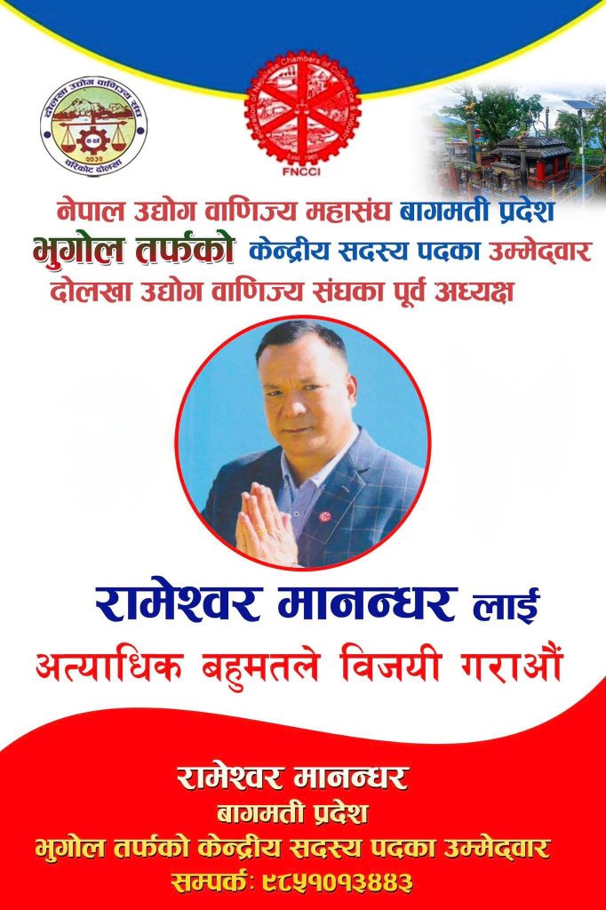 दोलखा/नेपाल उद्योग बाणिज्य महासंघका पूर्व केन्द्रीय सदस्य रामेश्वर मानन्धरले महासंघको आगामी चैत्र २९– ३० को ६० औ साधारणसभामा बागमती प्रदेश भुगोल तर्फको केन्द्रीय सदस्यमा उम्मेदवारी घोषणा गरेका छन् । उनले आफुलाई मत दिन व्यवसायीहरुलाई आग्रह समेत गरेका छन् ।